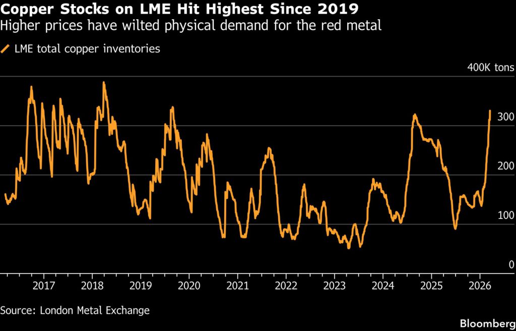 הצטברות מהירה של מלאי בורסה מתחילת השנה משקפת מצב רוח דובי הולך וגובר בשוק הפיזי של נחושת. המוכרים התקשו להוריד מטענים כשהביקוש נחלש בסין, בעוד שהמהירה לשלוח מתכת לארה"ב לפני מכסים פוטנציאליים פחתה. מחירים שהגיעו לשיא של מעל 14,500 דולר בסוף ינואר, ונשארו עלייה של 30% לעומת שנה שעברה, גורמים לקונים רבים להשהות.