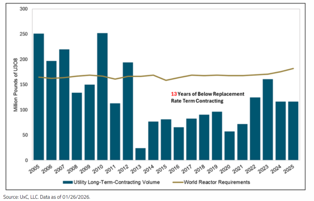חברות שירות רוכשות דלק גרעיני שנים קדימה, אבל ההתקשרות ירדה משיעור ההחלפה בשנה ה-13 ברציפות ב-2025, מה שדוחף צרכים לא מכוסים לעתיד. רכש דחוי זה בונה לחץ, לדבריו, ומעלה את הסיכון שחברות שירות יצטרכו לחזור לשוק מאוחר יותר עם היקפים גדולים יותר כדי להבטיח, פחות אפשרויות ומחירים גבוהים יותר.